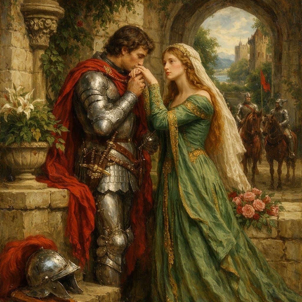 This detailed painting shows a handsome knight saying goodbye to a fair lady in a castle courtyard, rendered in the Pre-Raphaelite artistic style.