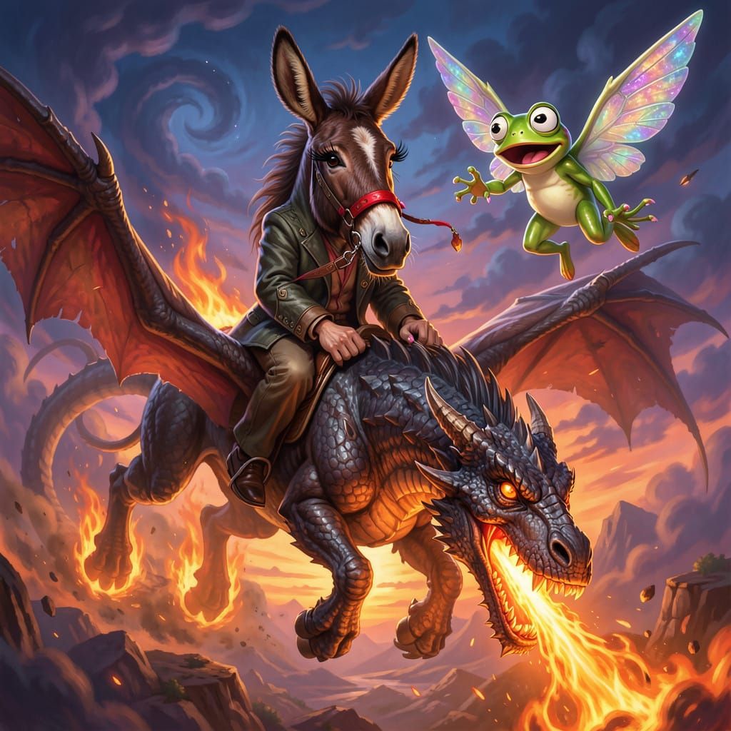 This image shows a donkey with lipstick and pink nails riding a dragon, fighting a frog angel. Rendered with cinematic lighting and dynamic action, it evokes a fantastical, epic battle.