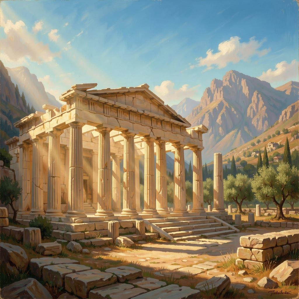 This image shows the ancient Temple of Apollo at Delphi, depicted as a detailed oil painting. Sunlight illuminates weathered stone pillars and ruins, set against dramatic mountains and a cerulean sky.
