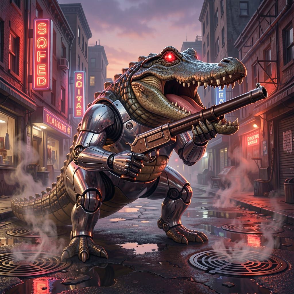 This image shows a hyperrealistic digital painting of a chrome robotic crocodile with glowing red eyes holding a Tommy gun. It stands on a gritty industrial street at dusk, with dramatic lighting and atmospheric colors.