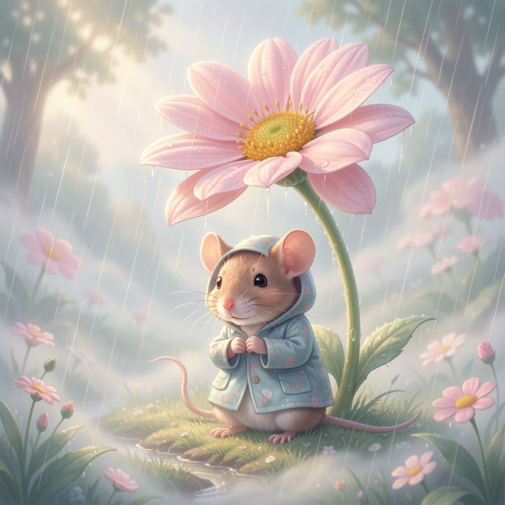 This image shows an adorable mouse in a raincoat sheltering under a flower during a gentle rain. It features hyperdetailed, ethereal fantasy art with soft, glowing light and a pastel color palette.