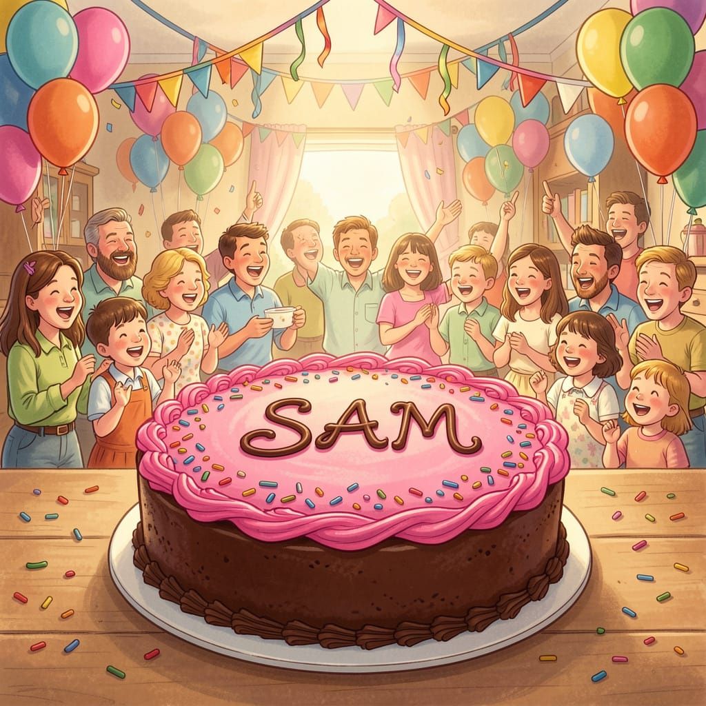 This image shows a delightful chocolate birthday cake with pink frosting and the name "SAM" in icing. It features a festive party scene with balloons and streamers, rendered in a cheerful, whimsical illustration style with soft lighting.