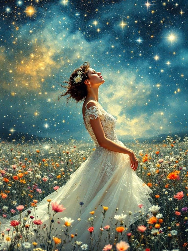 This image features a Vogue cover with a psychedelic double exposure effect. Stars fall onto a scene with wildflowers and a wedding dress, reminiscent of Maxfield Parrish's style.