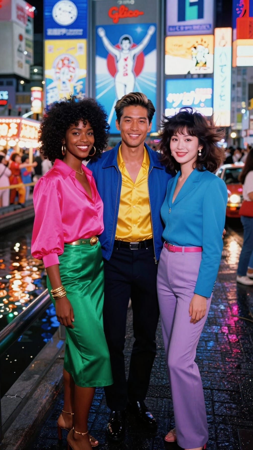 This image showcases three stylish individuals on a vibrant Dotonbori street, embodying 1980s fashion with bold colors, silk fabrics, and voluminous hairstyles.