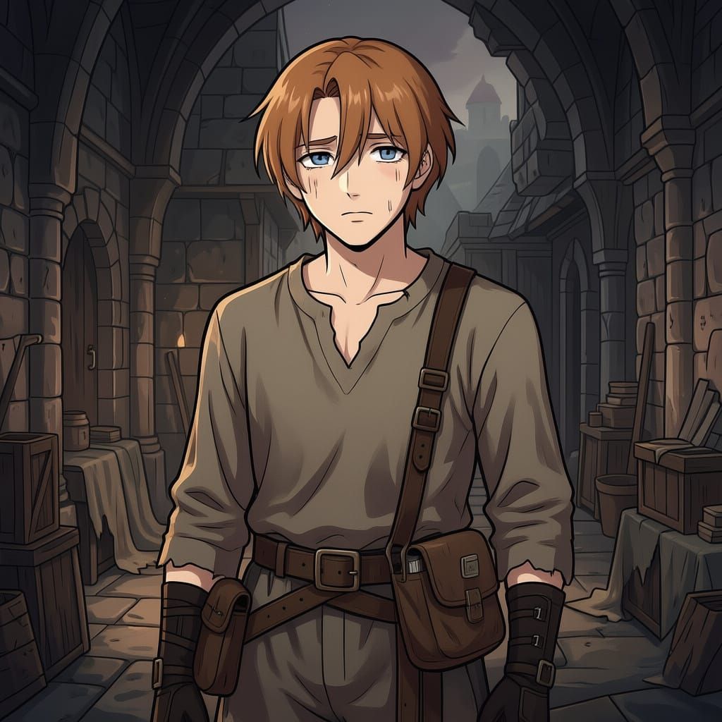 This image shows a young man in a medieval fantasy world, rendered in a flat, cel-shaded manga style with deep colors and cinematic lighting. He appears weary, dressed in tattered clothes, with a hidden book.