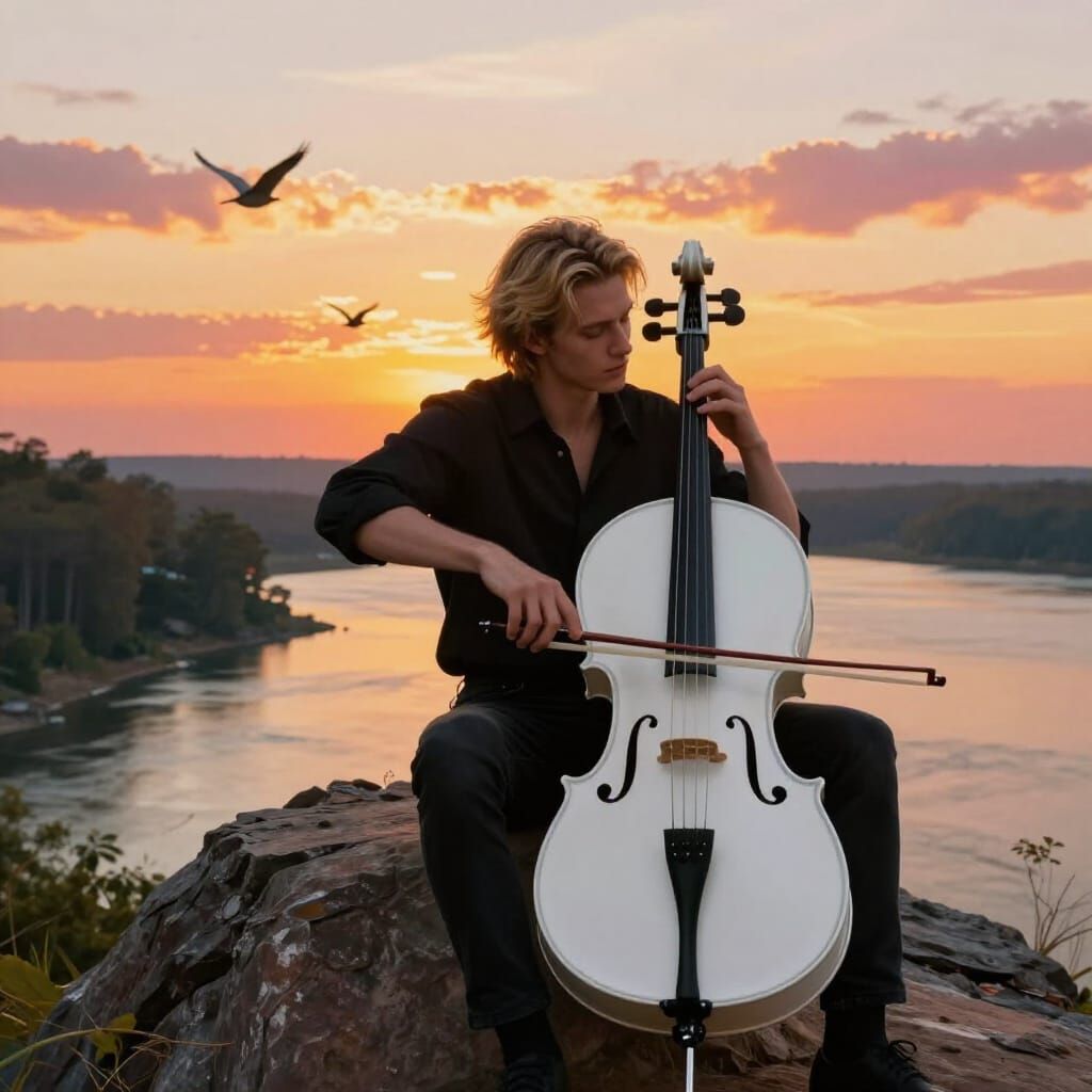 This image shows a young man playing a cello on a cliff edge during a vibrant sunset. The scene features a river, lake, and trees, rendered with dramatic lighting and a wide-angle perspective.