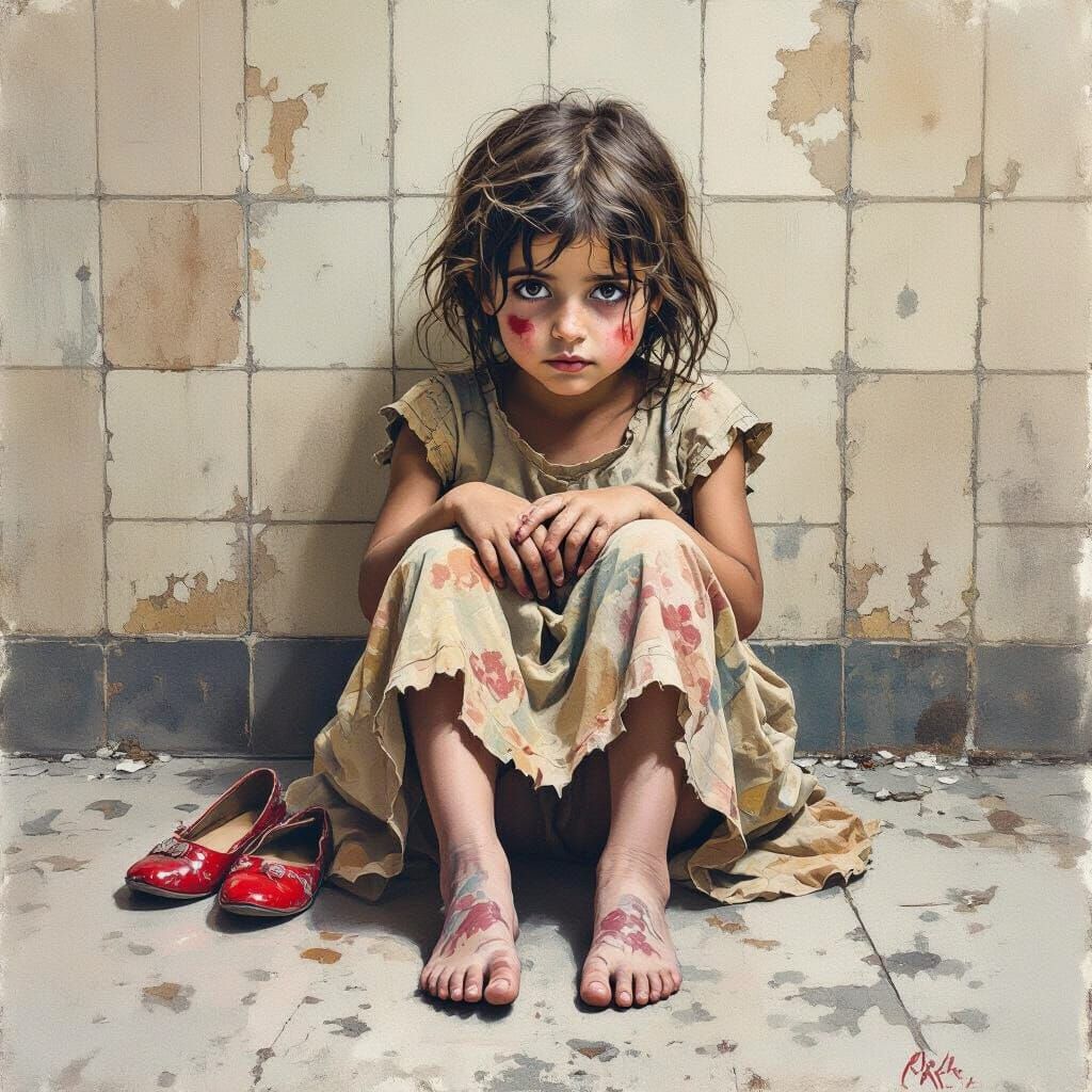 This image depicts a Syrian girl in a worn dress, seated on a hospital floor. She holds red shoes, her face conveying exhaustion and sorrow against a backdrop of muted tones, in a style evocative of emotional realism.