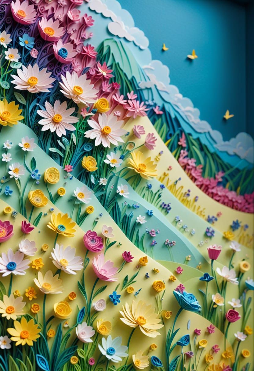 A detailed 3D papercraft and quilling art scene of a spring meadow. Layered, cut paper creates hills, grass, and blooming flowers in vivid shades of magenta, bright yellow, lime green, and cerulean blue. A few tiny, charming paper-sculpted figures are walking through the fields. The lighting is soft ...