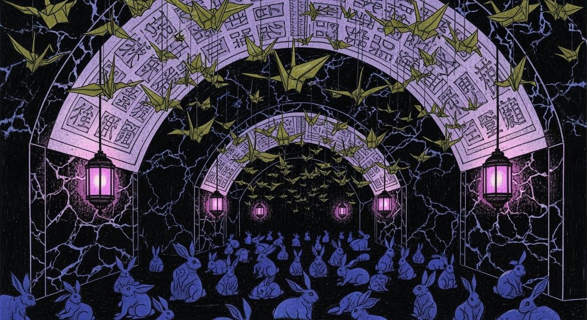 A limited palette (black/grey/indigo/mauve/olive/dark-teal) R.K. Post style coloured-ink and charcoal sketch of an vaulted ceiling (black/indigo marble; thousands of olive/dark-teal origami cranes hanging from the ceiling; embossed Japanese text; glowing mauve lanterns) with a floor covered in indigo/black ...
