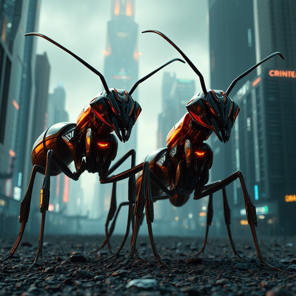 This image depicts a group of giant cyber ants, with their sleek, aerodynamic exoskeletons and mechanical limbs, set against a vibrant, futuristic cityscape with towering skyscrapers and neon lights, rendered in stunning 8K resolution with photorealistic quality, evoking an epic, sci-fi aesthetic inspire...
