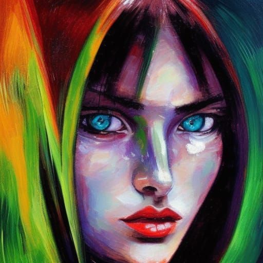 A hyperdetailed portrait of a space cadet with black hair, green eyes, and fangs, covered in blood. The image is rendered with dynamic lighting and triadic colors as a neo-impressionistic oil painting.