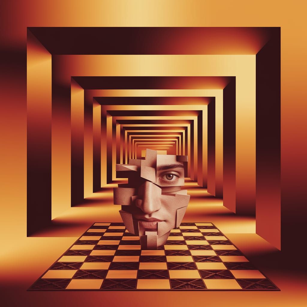 This image shows a fragmented face merging with a chessboard, set within warped, glowing corridors. It captures a dreamlike distortion of reality with a warm, minimalist color palette.