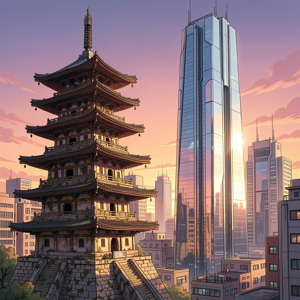 This image showcases a stunning contrast between an old East Asian pagoda and a modern chrome skyscraper at sunset. Digital matte painting captures this juxtaposition of eras with dramatic lighting.