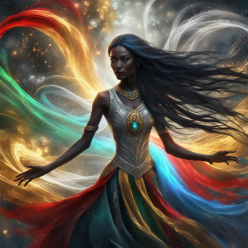 This image shows a woman with long, flowing black and silver hair dancing, surrounded by auras of many colors emanating from within. Digital painting in a fantasy concept art style.