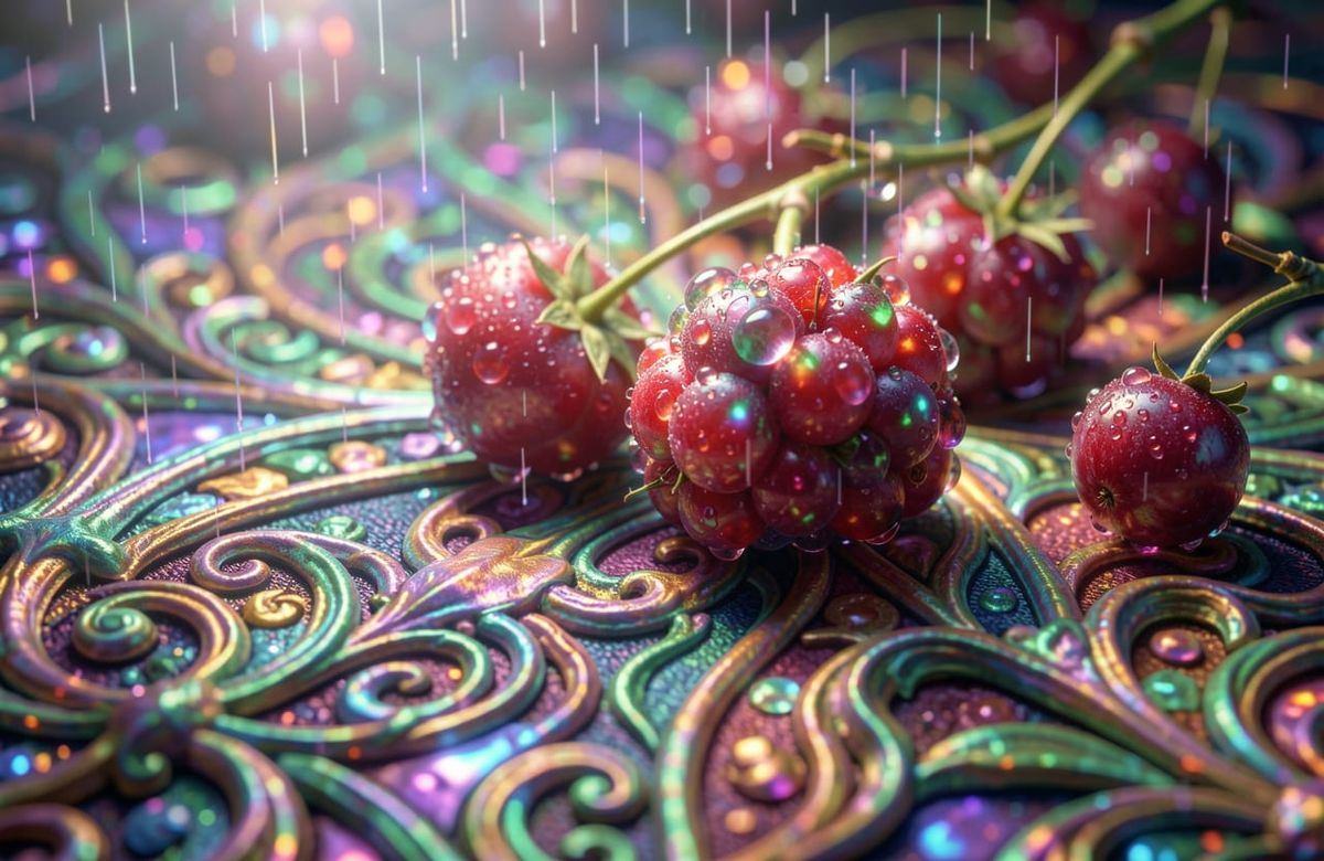 This digital painting showcases dewy rainberries woven into a baroque brocade pattern with organic, bioluminescent textures. It features dramatic lighting and iridescent colors, creating a surreal, mesmerizing atmosphere.