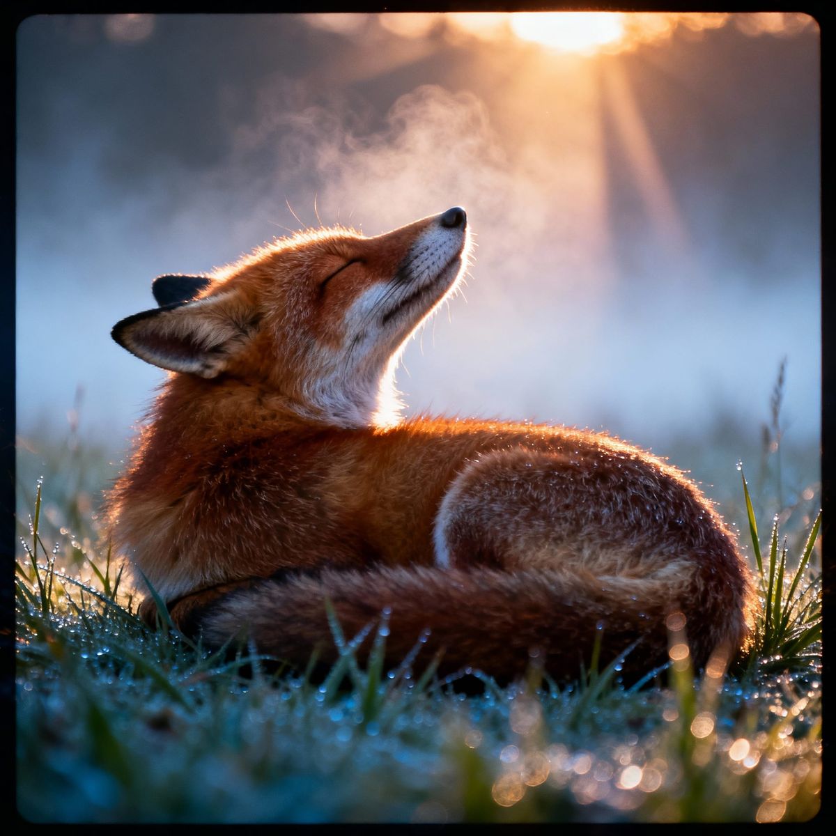 This image captures a serene red fox at dawn, peacefully sleeping amidst dewy grass. The scene features soft, cinematic lighting and a painterly aesthetic, evoking a calm and intimate atmosphere.