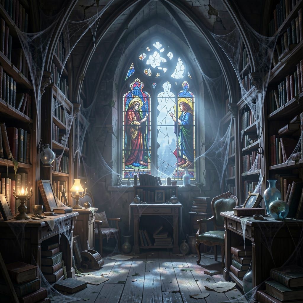 This image depicts an ancient, crumbling gothic library filled with arcane books, illuminated by moonlight through a broken window. It features a hyperrealistic digital matte painting style with dramatic shadows and glowing magical details.