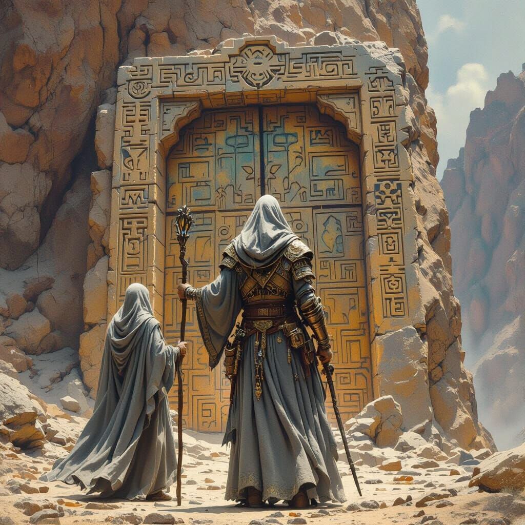 This image shows a wizard with detailed armor standing before a colossal, ancient door on a mountain. It features vibrant colors and bold brushstrokes, reminiscent of Tamayo's work.