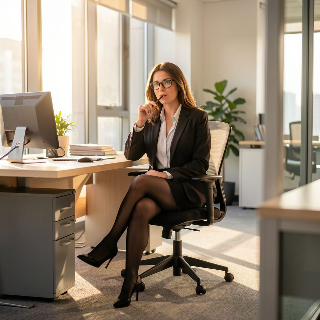 This photorealistic image shows a secretary in a short skirt, tights, and glasses at her desk in a modern office, chewing a pen. Cinematic lighting and a shallow depth of field enhance the lifelike detail.