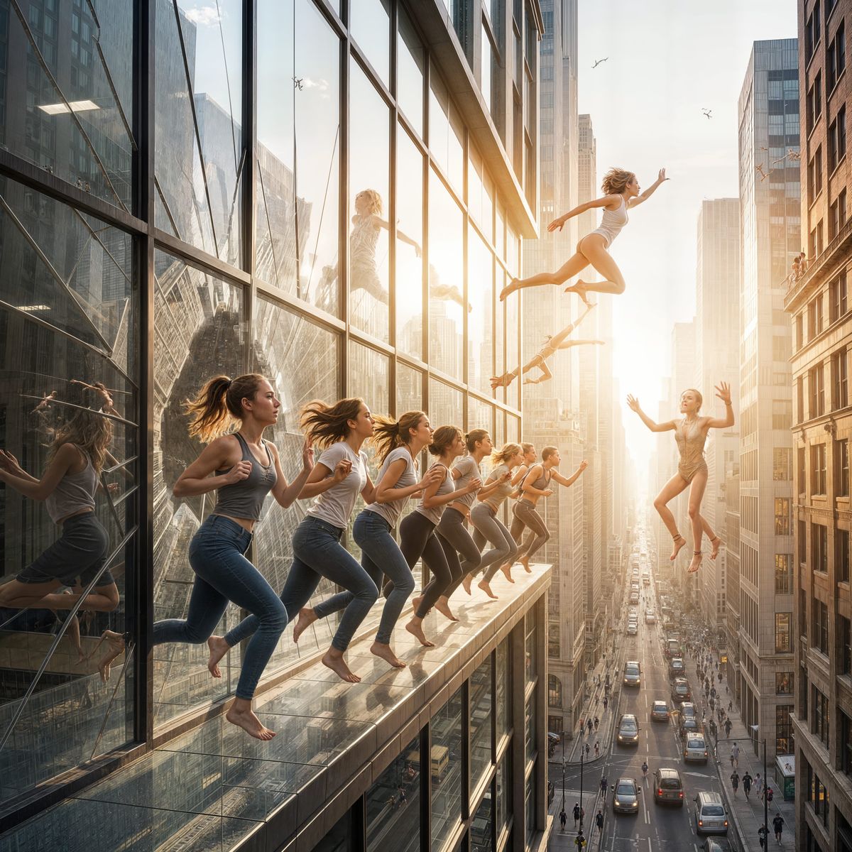 A group of young women and men, all barefoot, run side by side in a straight line inside a skyscraper, speeding towards the building's expansive glass facade. One jumps from the roof, and all the others follow, metaphorically plunging out the window as a symbol of their unyielding will to break free from the civilized captivity and servitude of routine and the discipline of economic efficiency and efficiency.