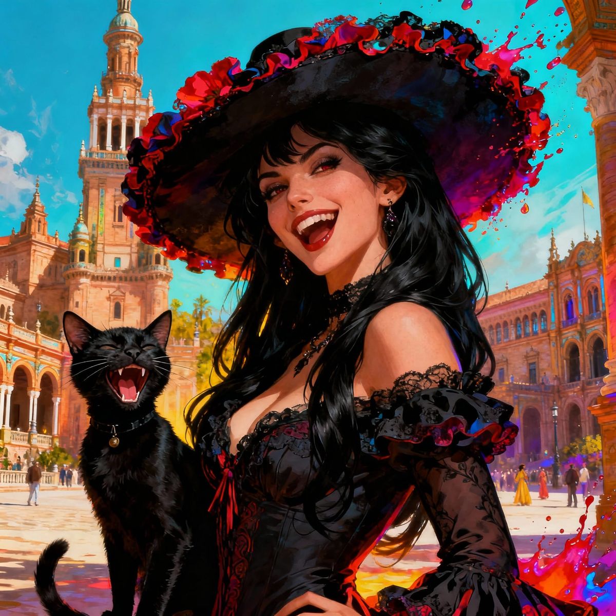 This image shows a flamenco dancer with long black hair and a laughing black cat, presented as a detailed concept art portrait with dramatic lighting and vibrant colors.