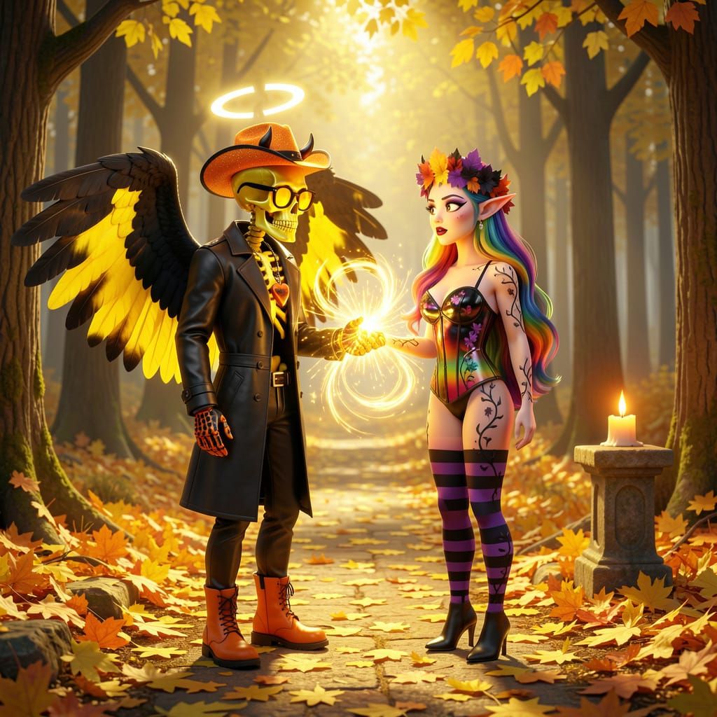 This image showcases a detailed 3D render of a skeleton character in a cowboy hat and trench coat on a vibrant autumn forest path. Features moody lighting and an enchanted atmosphere.