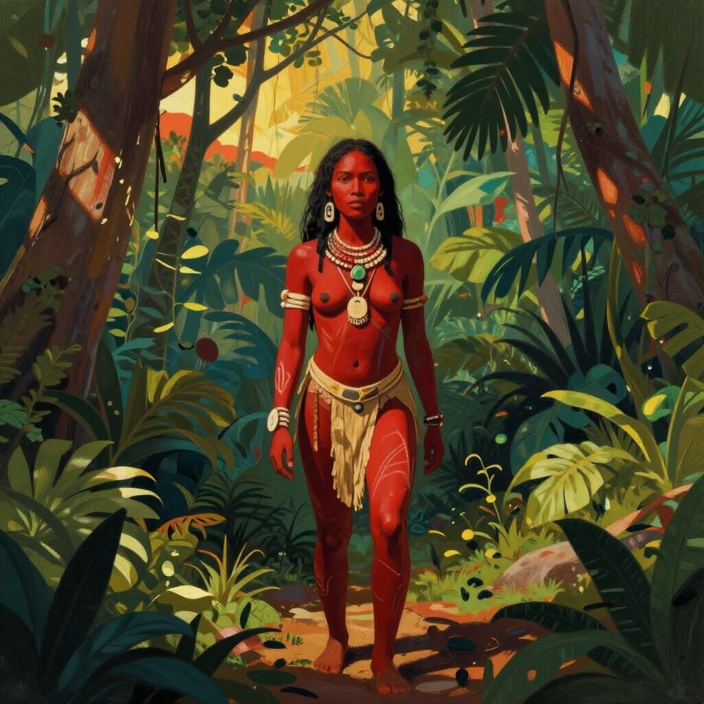 This image shows a prehistoric woman with striking red body paint and primitive jewelry in a lush jungle. Rendered in a vibrant, painterly style with bold outlines and earthy colors.