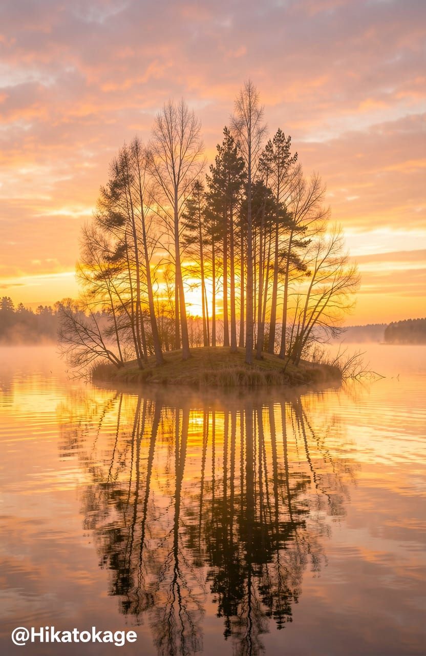 This image shows a photorealistic landscape at sunset with a small island of trees reflected in calm water. Warm sky colors and light mist create a mystical, peaceful golden hour scene.