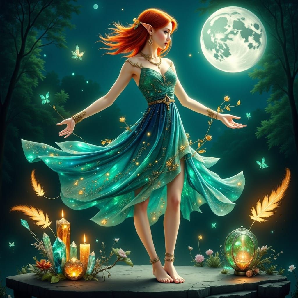 This image shows an elf woman with short red hair and emerald eyes, adorned in a sapphire dress and golden jewelry, dancing barefoot under the moonlight amidst magical crystals, feathers, and candles.