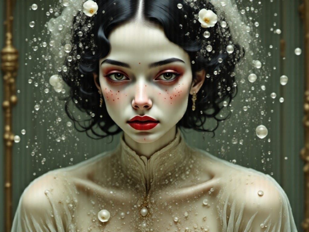 A hyperdetailed concept art portrait of a woman with flowing hair, her face obscured by swirling foam. Features dynamic lighting and triadic colors, rendered in Unreal Engine 5.