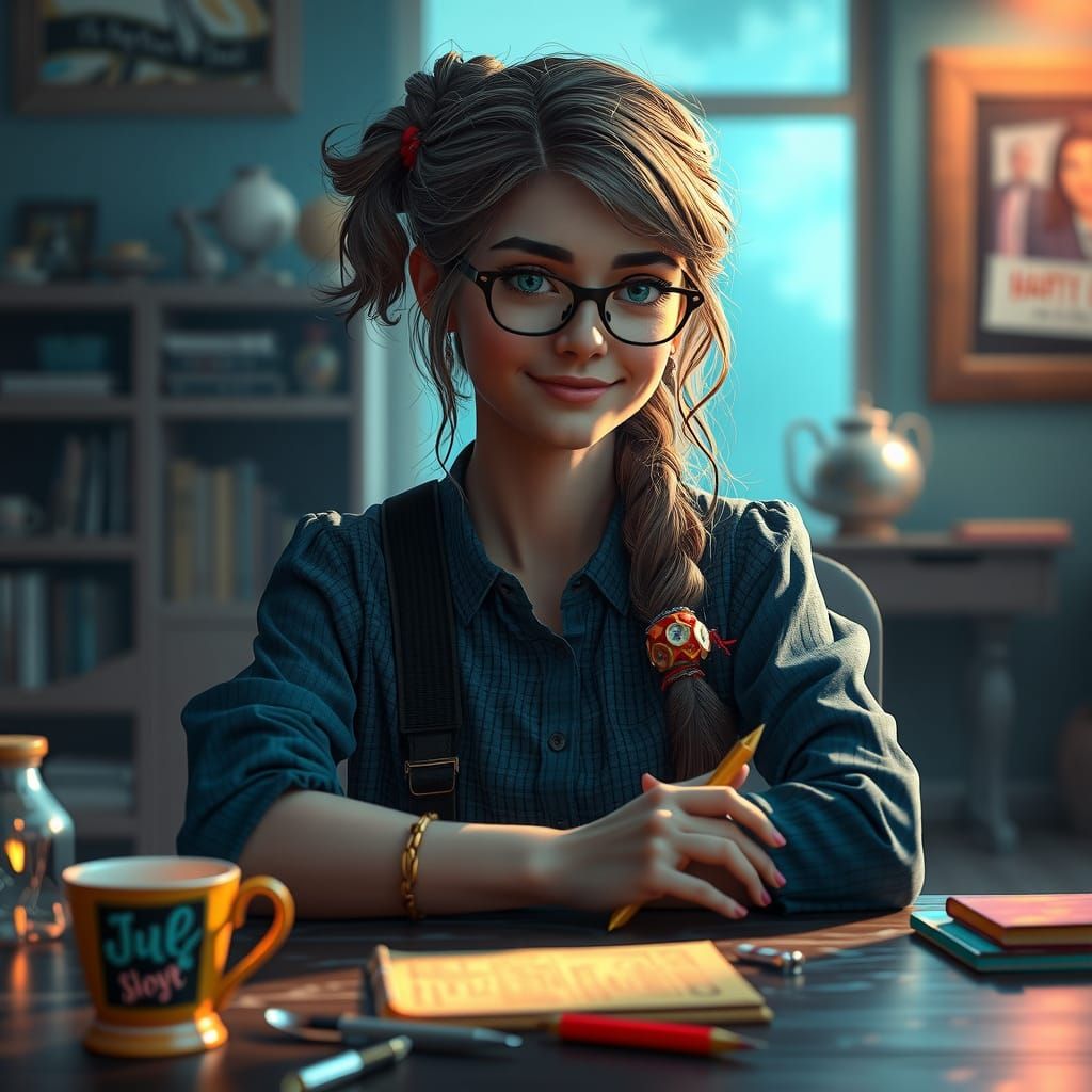 This hyperdetailed splash art portrait shows a teacher at a magic table, bathed in soft, volumetric light. The scene features intricate details and triadic colors, rendered with exceptional clarity.