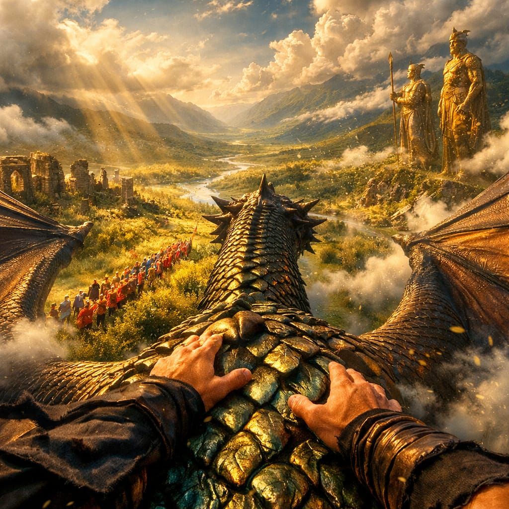 A cinematic first-person view of a dragon rider soaring over a vibrant, blooming valley filled with marching adventurers. Sunlight glints off dragon scales.