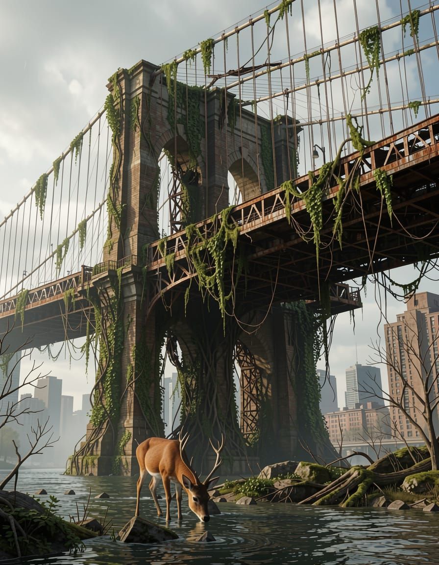 This image depicts a moss-covered, rusted Brooklyn Bridge a century after a global catastrophe. A deer drinks nearby, set in a highly detailed, dynamically lit 3D render.