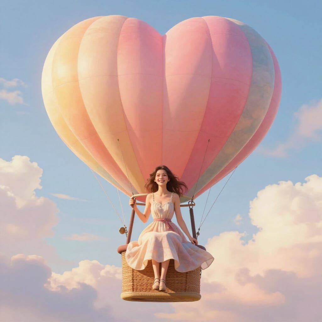This image shows a woman in a sundress inside a heart-shaped hot air balloon against a cloudy sky. It is rendered in a colorful, storybook illustration style with a pastel palette.