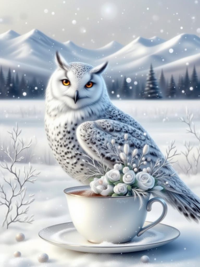 This image features a stunning snowy owl perched inside a white teacup overflowing with froth. The scene is set against a backdrop of snow, ice, and distant winter mountains, creating a surreal winter landscape.
