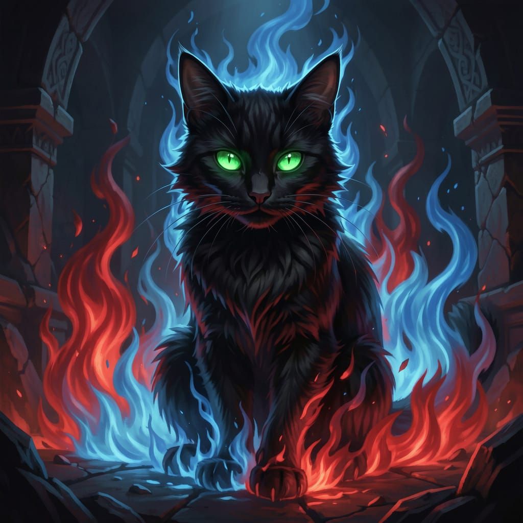 A dark fantasy digital painting of a black cat with glowing emerald eyes, engulfed in mystical blue and red flames. The art features atmospheric lighting and intricate details in a dramatic, contrasting color palette.