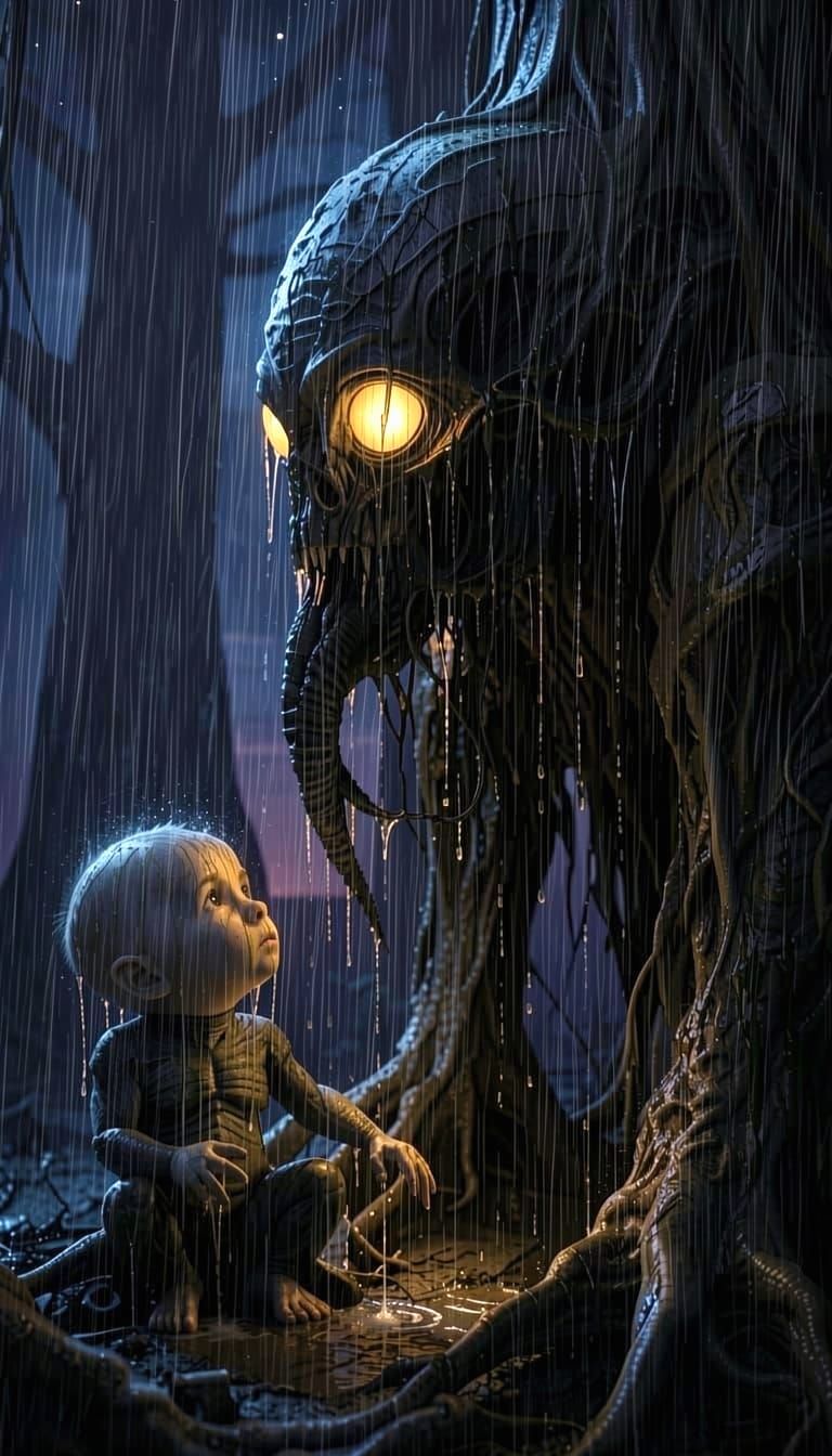 A colossal, creepy, gooey amorphous creature oozing with dark, viscous slime, surprising a tiny, impossibly cute baby. The baby, with wide, innocent eyes, is partially hidden behind a gnarled tree root. Dramatic chiaroscuro lighting accentuates the textures and scale difference, casting long, unsettling ...