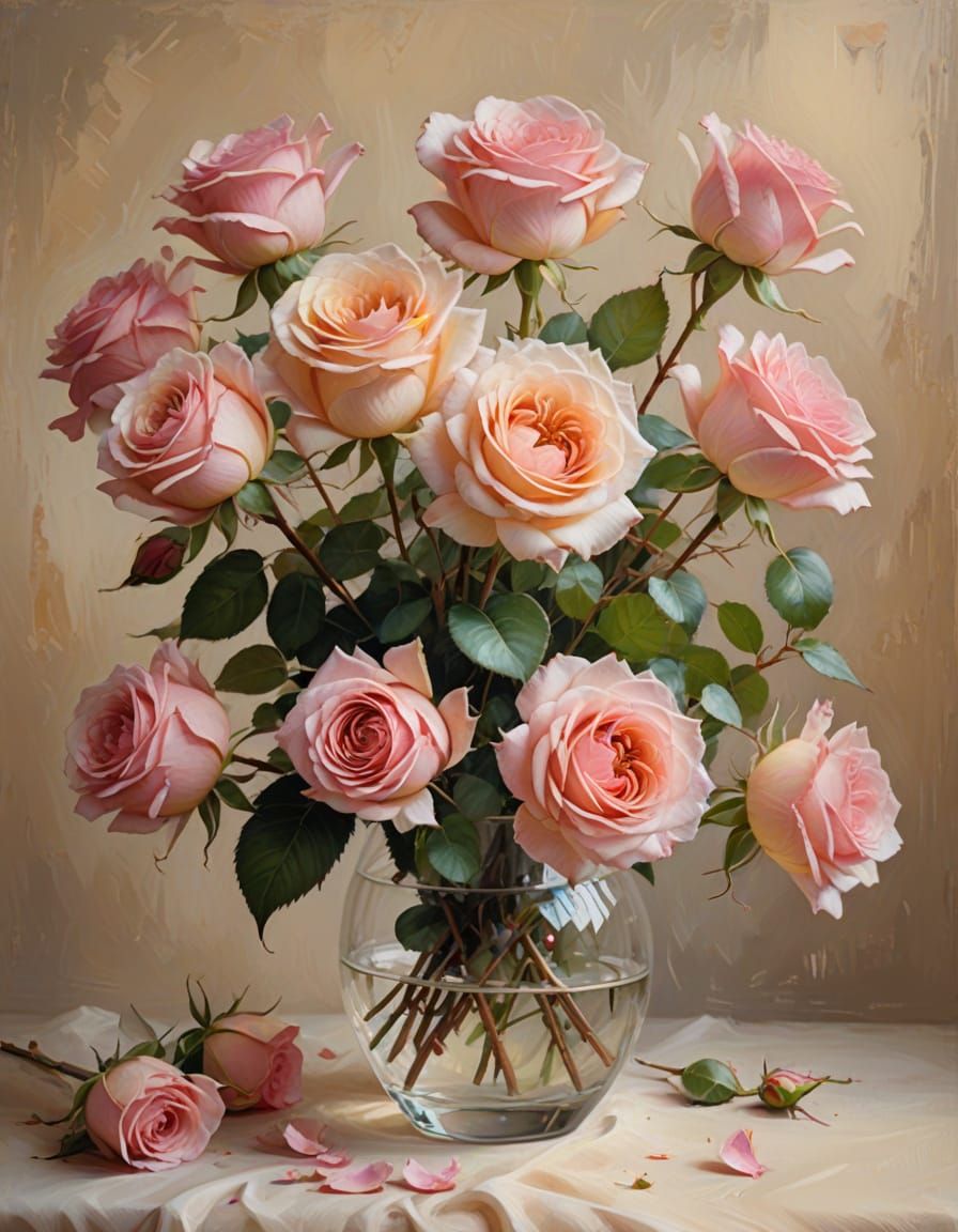 This beautiful impressionist painting features a close-up of a delicate bouquet of pink roses in a clear glass vase on a soft beige background, with soft focus and delicate light reflection.