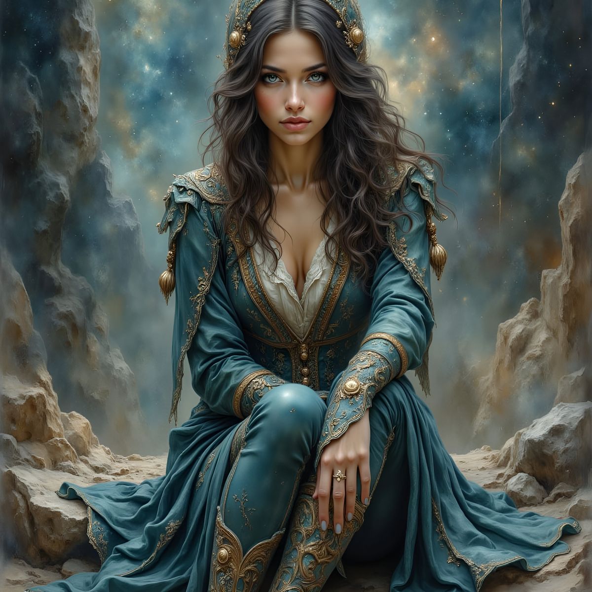 A realistic portrayal of a woman in her early thirties seated on rocky terrain against a cosmic backdrop. She wears an ornate teal coat, patterned leggings, and leather boots, with a nebula streak in the sky.