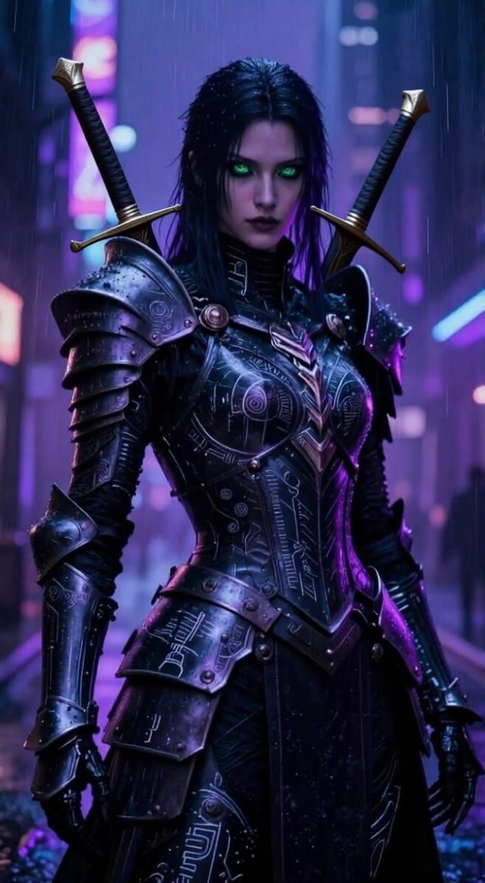 This image shows a graceful cyborg warrior in ornate Gothic armor on a neon-lit street. Hyperrealistic detail and dramatic lighting create a somber, fantastical future atmosphere.