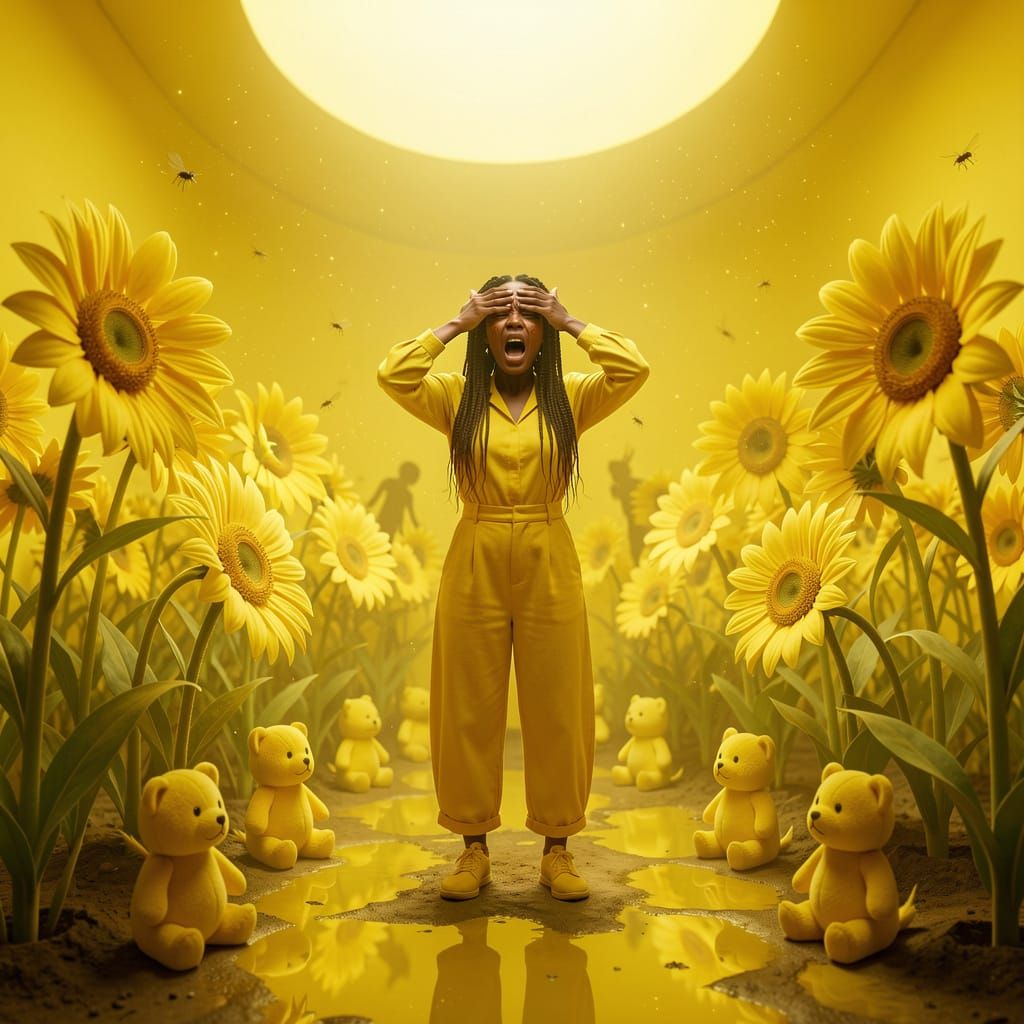 This image depicts a woman screaming in terror within a room saturated in various shades of yellow. The overwhelming color and unnerving details create a suffocating, claustrophobic atmosphere.