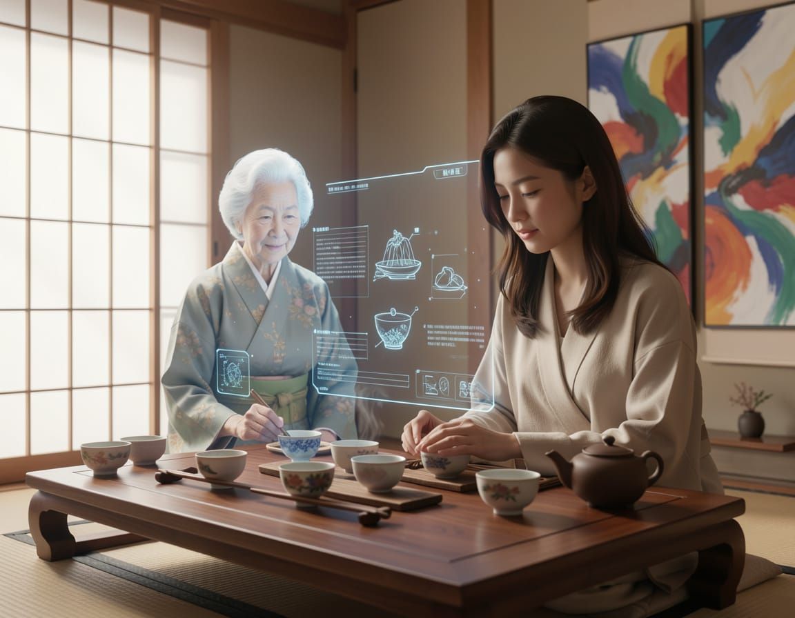 This image depicts a serene tea ceremony where a holographic elder meets a human woman. Soft lighting and fine details create a calm, subtly futuristic atmosphere.