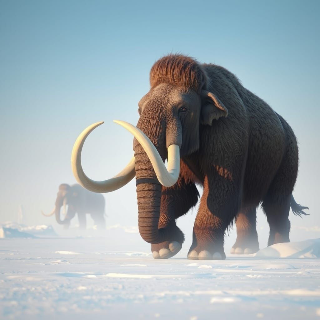 A stunning, digitally rendered image of a majestic mammoth set against a dreamy, pale blue tundra, with intricate details and textured style reminiscent of sci-fi artwork and digital landscapes.