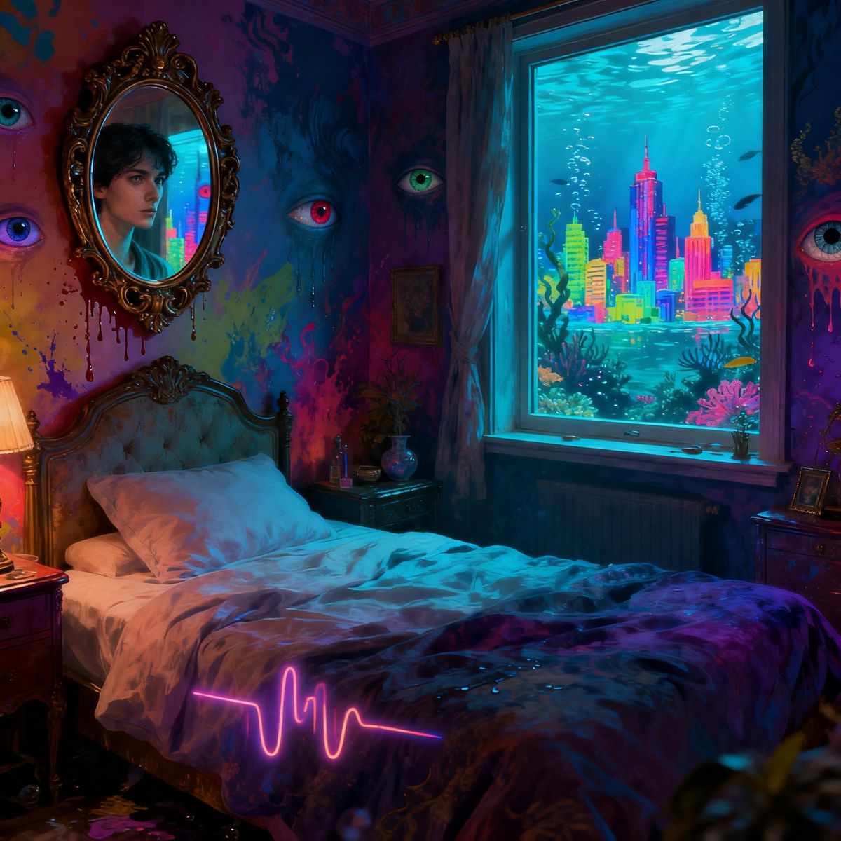 This image shows a surreal bedroom where objects have eyes, the bed breathes, and the mirror shows another person. The window reveals an underwater city. Rendered with hyperrealistic detail and dramatic lighting.