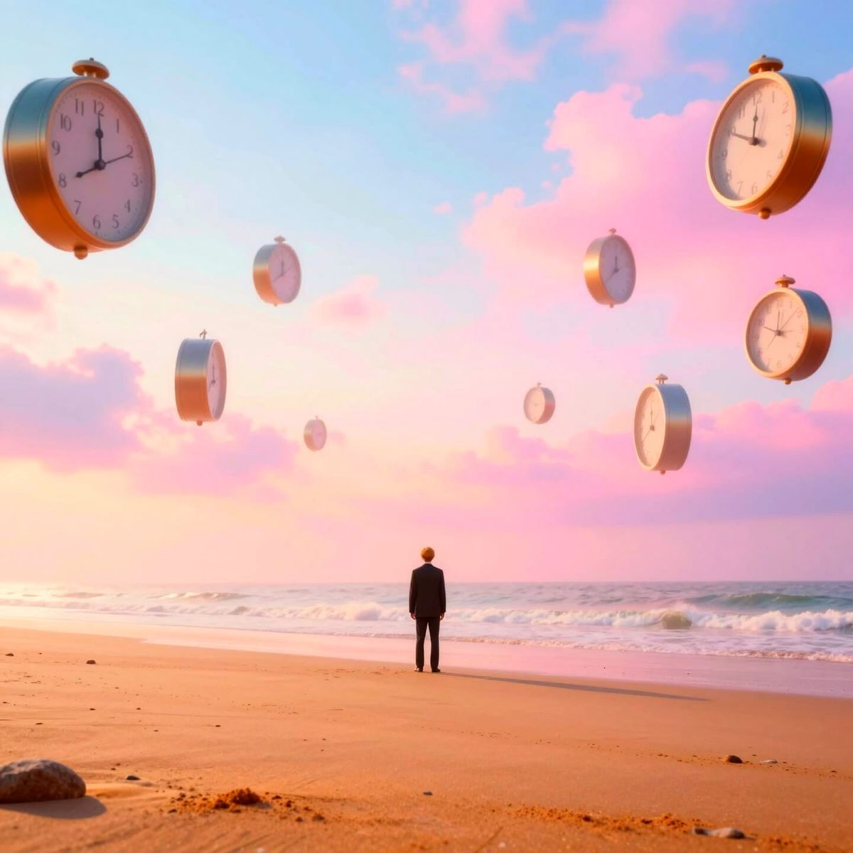This image depicts a lone man on a surreal beach with a dreamlike sky. It features floating clocks and impossible structures, rendered in a photorealistic style with ethereal lighting and soft pastel colors.