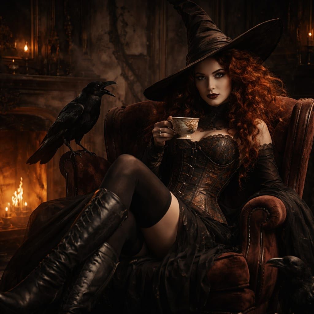A cinematic shot of a dark fantasy Victorian parlor. A mesmerizing, pale-skinned witch with wild, voluminous auburn curls lounges provocatively in a weathered burgundy velvet armchair. She wears a tall, crooked striped witch hat and a detailed patchwork corset of stitched indigo and espresso leather. ...