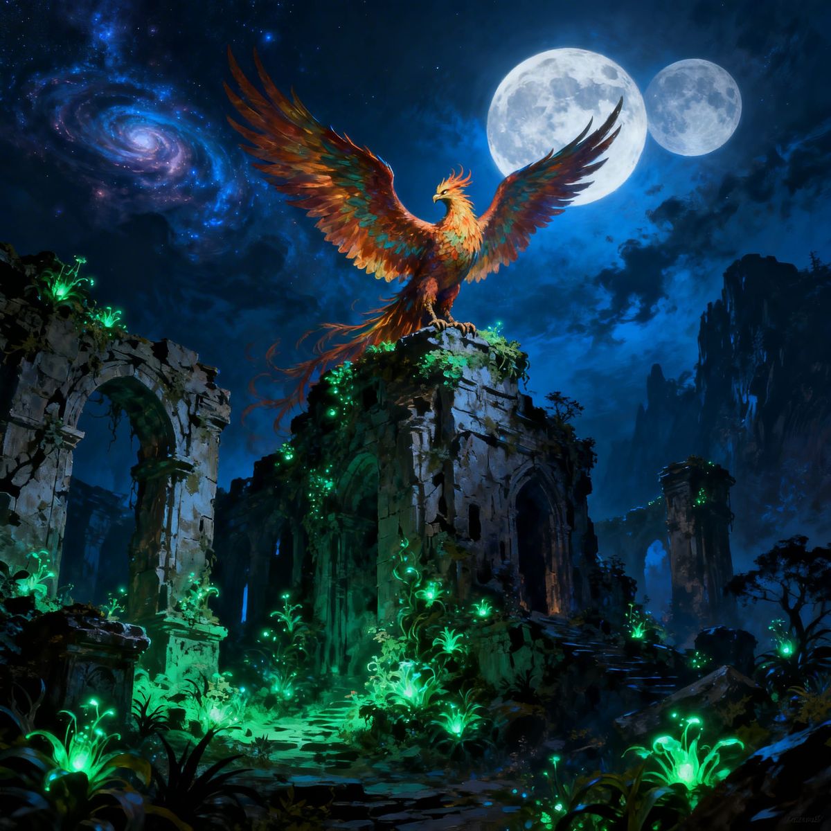 This image shows a majestic phoenix perched on ancient ruins covered in glowing plants, under a twin moonlit sky with nebulae. Rendered as epic fantasy concept art with atmospheric lighting and a dark fantasy feel.