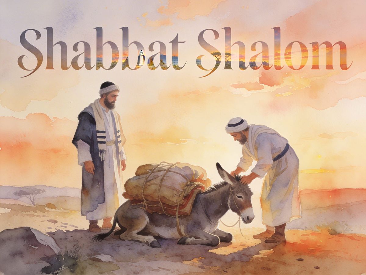 This dreamy watercolor illustration depicts a compassionate moment of two men helping each other with a fallen donkey. The scene evokes a warm, peaceful spiritual atmosphere with soft sunset tones and gentle blending.