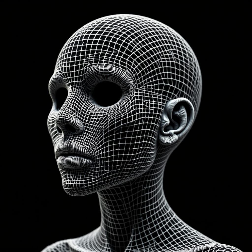 human face dissolving completely into polygon mesh topology, identity collapsing into pure wireframe structure, hollow eye sockets formed by empty grid space, digital decay, skeletal lattice replacing flesh, stark lighting, monochrome with sharp highlights, existential surrealism, ultra-detailed 3D wireframe ...