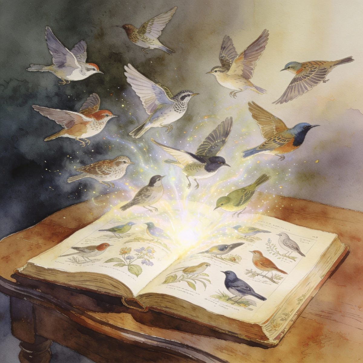 This image shows an antique guidebook with ornithological illustrations. Ethereal birds fly from the pages into a study, rendered in a classical watercolor style with a magical touch.